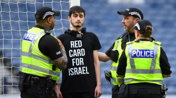 متظاهر يربط نفسه بعمود المرمى ويعطّل مباراة للاحتلال